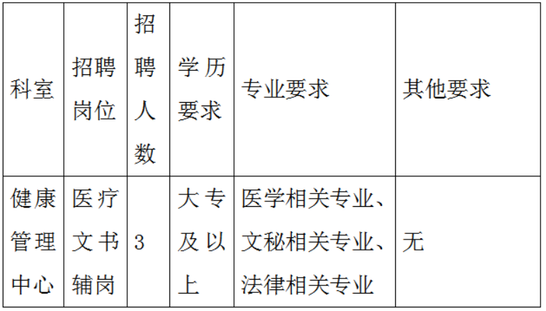 康管理中心面向社會(huì)公開招聘輔助崗位人員3名(非事業(yè)編制,勞務(wù)派遣方式),現(xiàn)將有關(guān)招聘事宜公告如下: